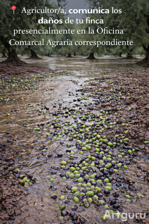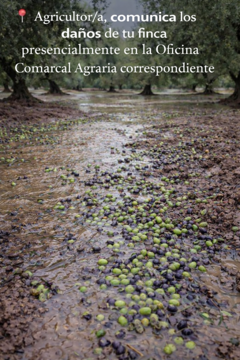 ¿Quién puede comunicar los daños?📍 Agricultores/as afectados/as por las lluvias que hayan sufrido daños en sus terrenos y cosechas, especialmente en olivos, deben comunicarlo para poder acceder a las ayudas y servicios habilitados por la Administración.