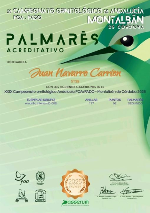 También destacó el trabajo de Juan Navarro Carrión (5T39), quien obtuvo el segundo puesto en la categoría Amarillo Intenso (D-006) con 92 puntos. Su participación fue reconocida por los jueces del campeonato por la excelente presentación y calidad de su ejemplar, reflejo de la constancia y dedicación que caracterizan su trayectoria como criador.