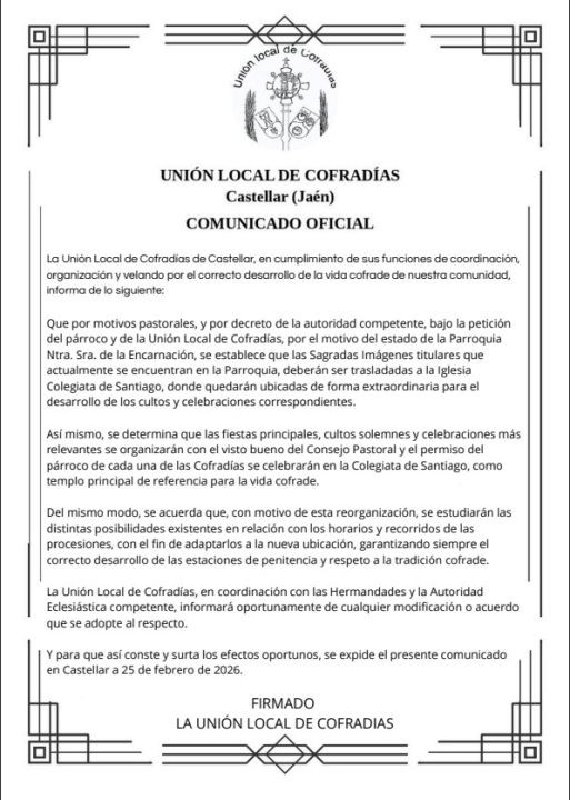 El comunicado, fechado en Castellar a 25 de febrero de 2026, refleja el compromiso de las cofradías locales por mantener viva la tradición y garantizar el normal desarrollo de la vida religiosa del municipio pese a las circunstancias actuales.