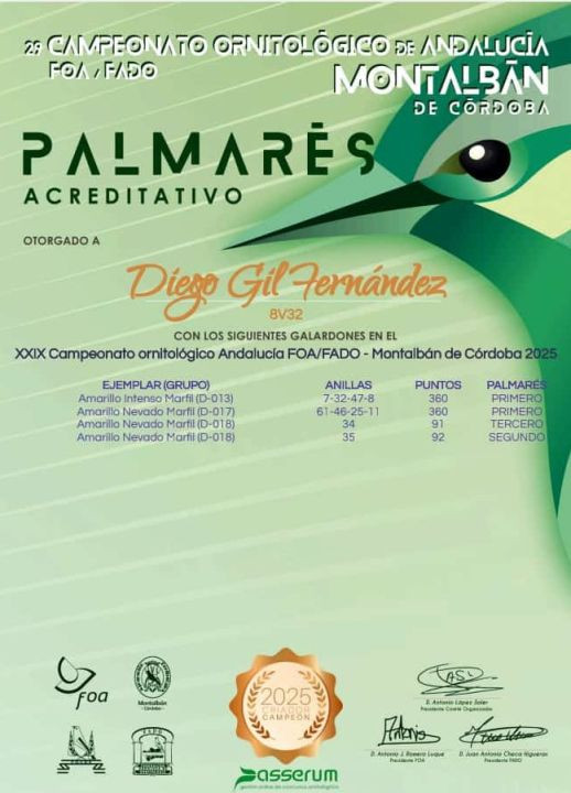 Diego Gil Fernández, múltiples primeros puestosEl criador castellariego Diego Gil Fernández (8V32) fue uno de los grandes protagonistas del certamen. Sus ejemplares de Amarillo Intenso Marfil (D-013) y Amarillo Nevado Marfil (D-017 y D-018) alcanzaron puntuaciones sobresalientes, llegando hasta los 360 puntos, y consiguiendo varios primeros, segundos y terceros premios en sus respectivas categorías.